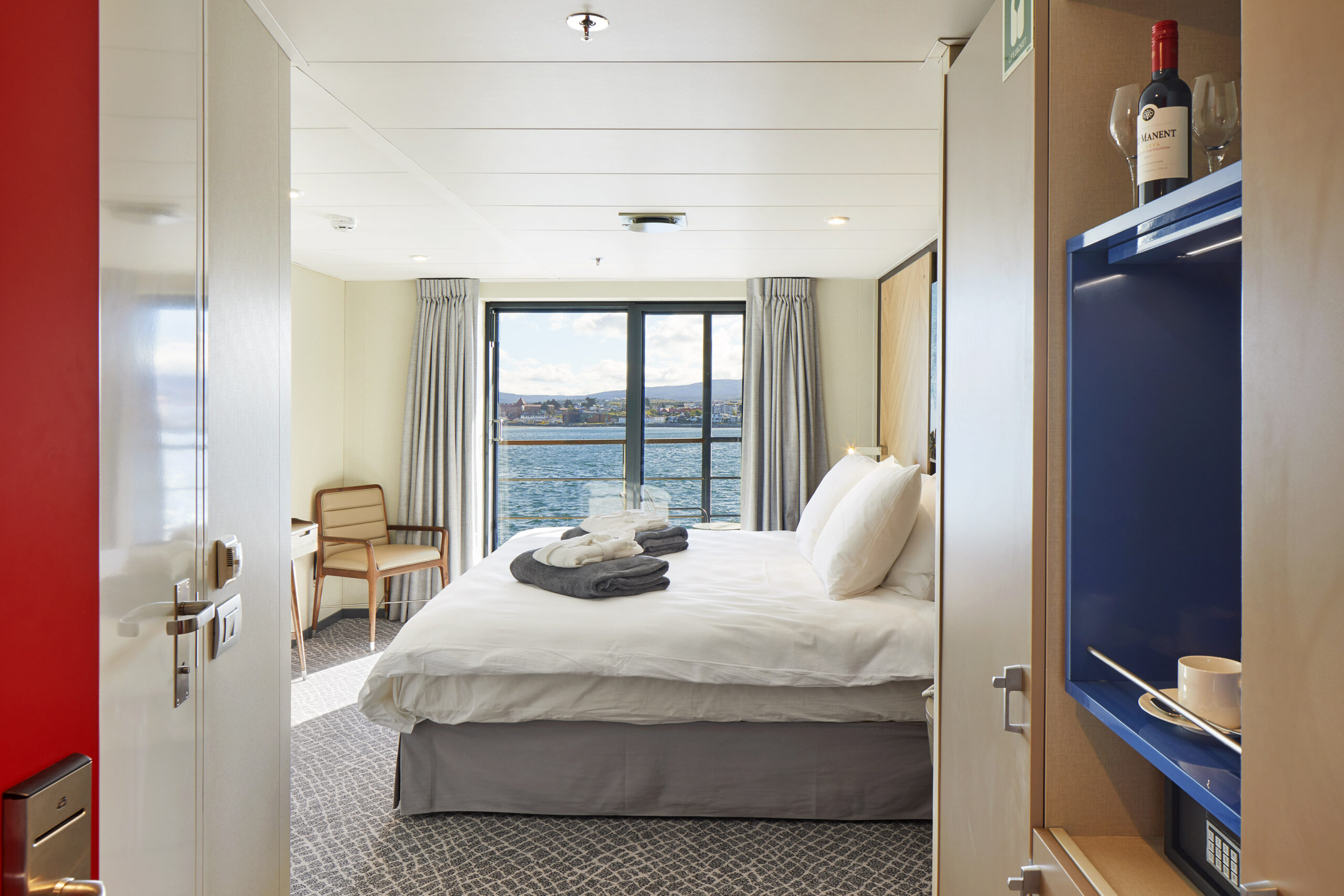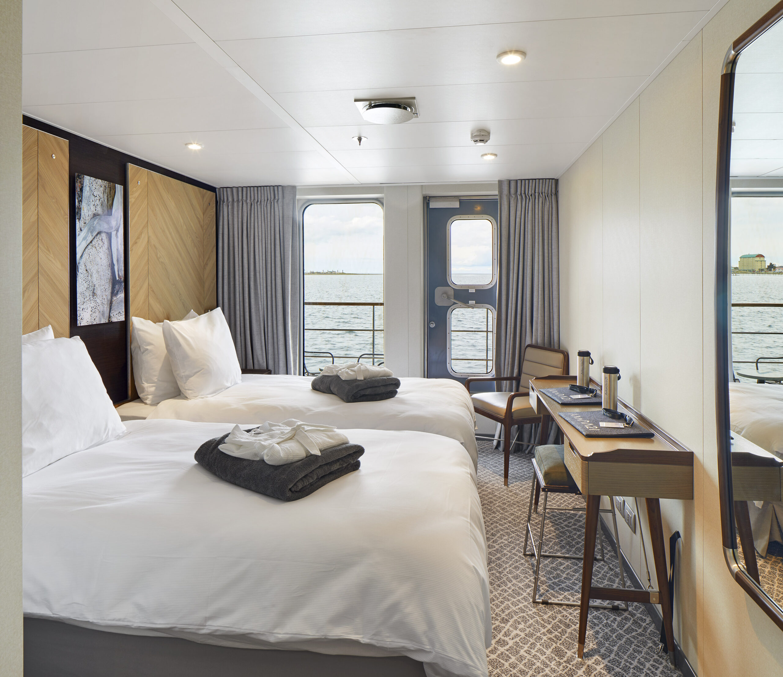 The small ship can accommodate up to 76 guests on air-cruises and 96 guests on sea voyages in seven cabin categories. All cabins feature a wardrobe, individually controlled heating system, a sitting area, and a private bathroom with a shower and heated floors.
