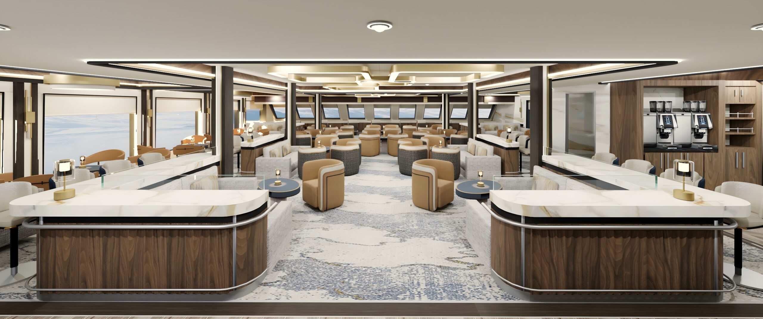On board, guests can enjoy a panoramic observation lounge and presentation room equipped with cutting-edge audiovisual technology. The ship also boasts a spacious dining room, a bar, a library, a meeting room, a gym, a sauna with an open view, and a medical clinic.