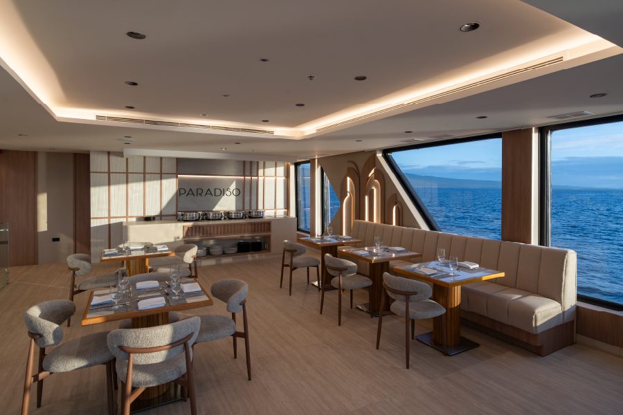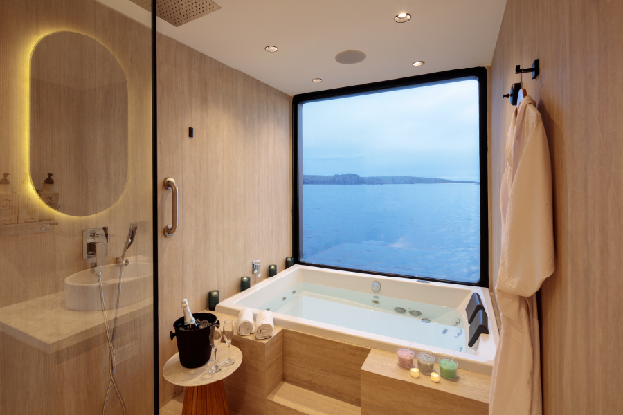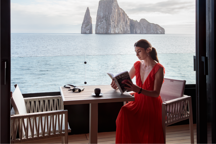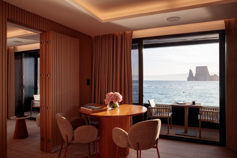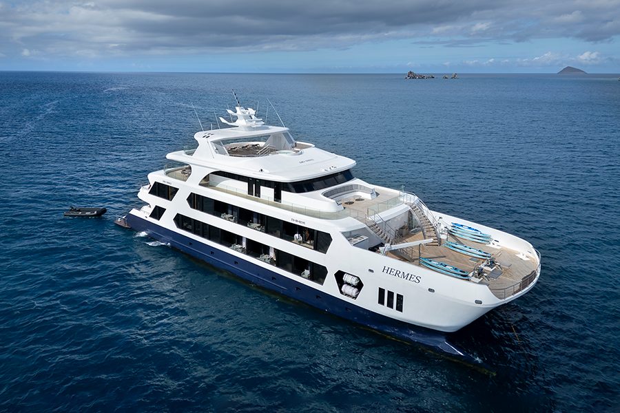 Hermes Mega Catamaran offers a new level of ultra-luxury cruising in the Galapagos, hosting just 20 guests with nearly one-to-one service. All suites include private balconies and ocean-view jacuzzis, while personalized butler service ensures every detail is covered — from in-suite breakfast to curated drinks. After island excursions, unwind in the onboard spa and hammam with views of the volcanic landscape.