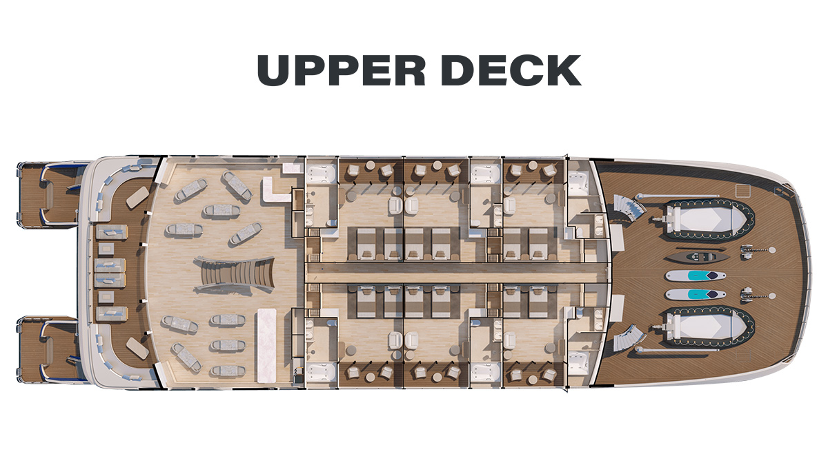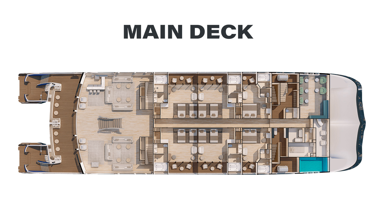 The two single suites are 22 m² (237 ft²) and are located on the main deck.