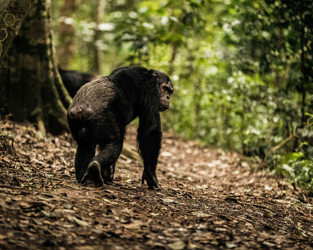 Walk through dense forest, listening to the calls of chimpanzees echoing through the trees.
